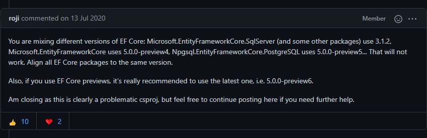 해석하면 EFCore 버전과 서드파티 패키지가 참조하는 EFCore의 버전이 일치해야 한다는 뜻이다. 현재 개발중인 서비스가 MySQL, MSSQL, InMemory 3가지 구현체를 쓰다보니 버전이 꼬였던 것이다.
