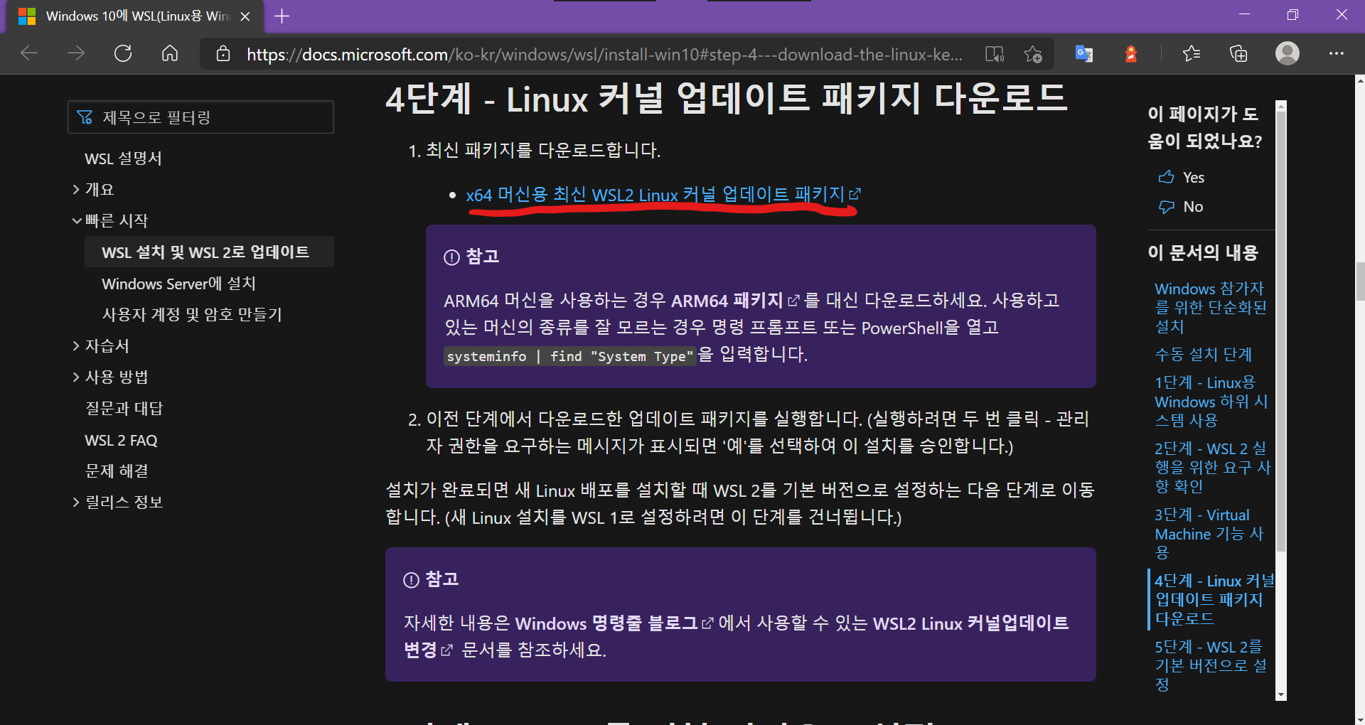 해당 링크를 누르면 아래 페이지가 표시된다. "x64 머신용 최신 WSL2 Linux 커널 업데이트 패키지"를 선택하여 WSL2 관련 설치파일을 다운로드 받는다.