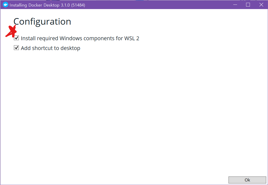 설치파일을 실행하고 기다리면 아래 옵션이 표시된다. 그 중 WSL2 는 반드시 선택해야 한다. 선택하지 않고 설치를 진행하면 Hyper-v(Win10 Home의 경우, Virtual Box) 기반 Windows Docker 설치과정을 수행하게 된다.