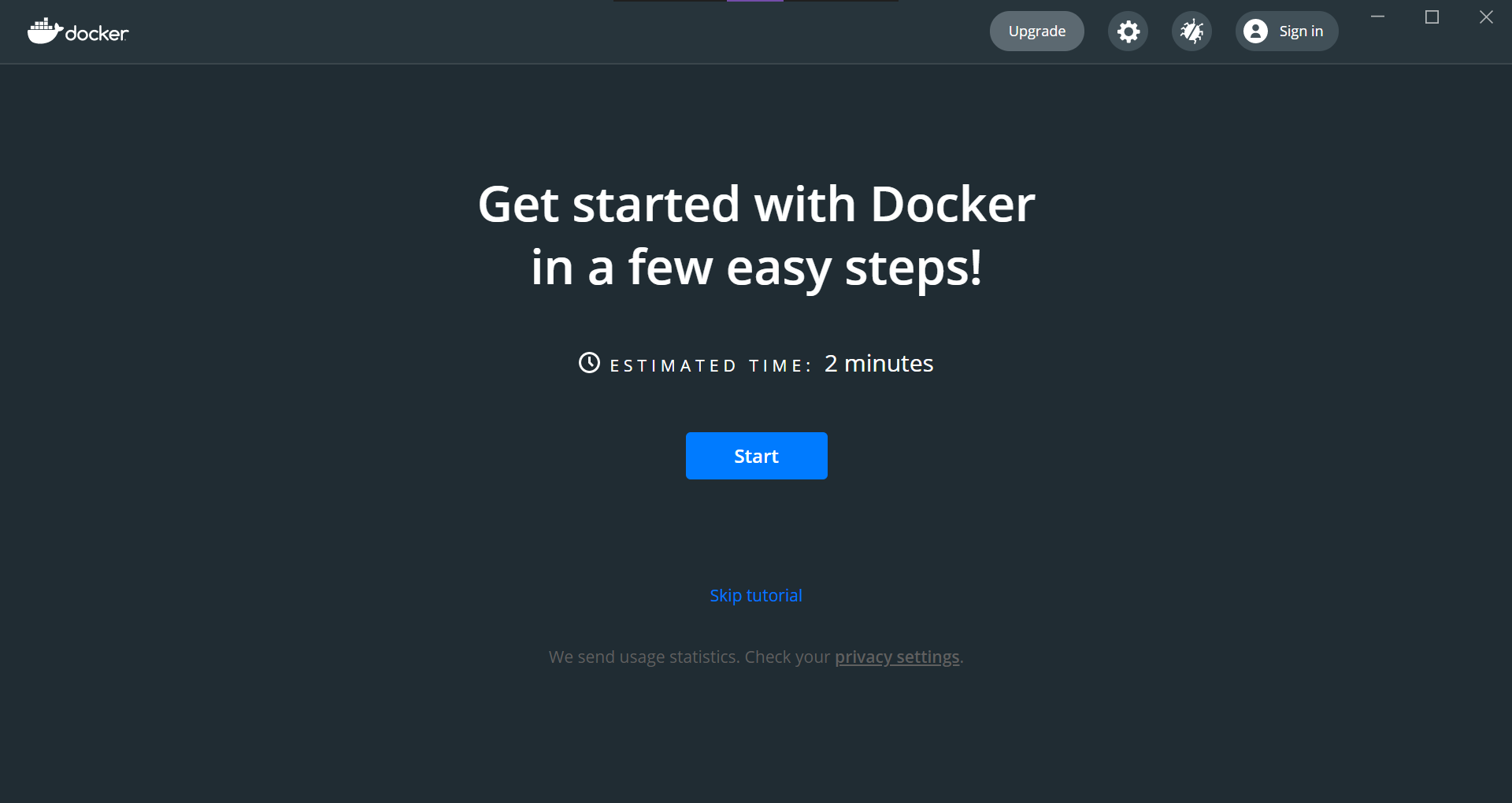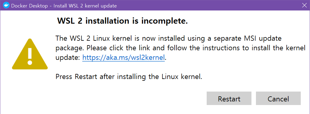 재실행 후 기다리면 Docker 에서 다음과 같은 메시지를 화면에 표시하게 된다. 이는 WSL2 설정이 되어있지 때문에 표시된 메시지이며, update : https://aka.ms/wsl2kernel 을 선택하여 WSL2 설치 과정을 진행해야 한다.