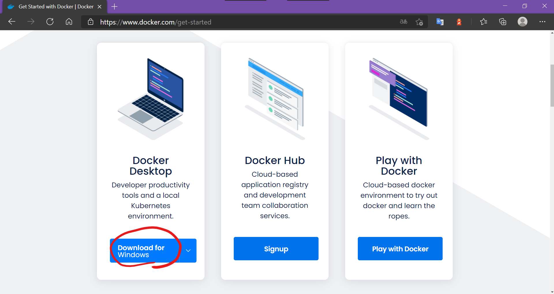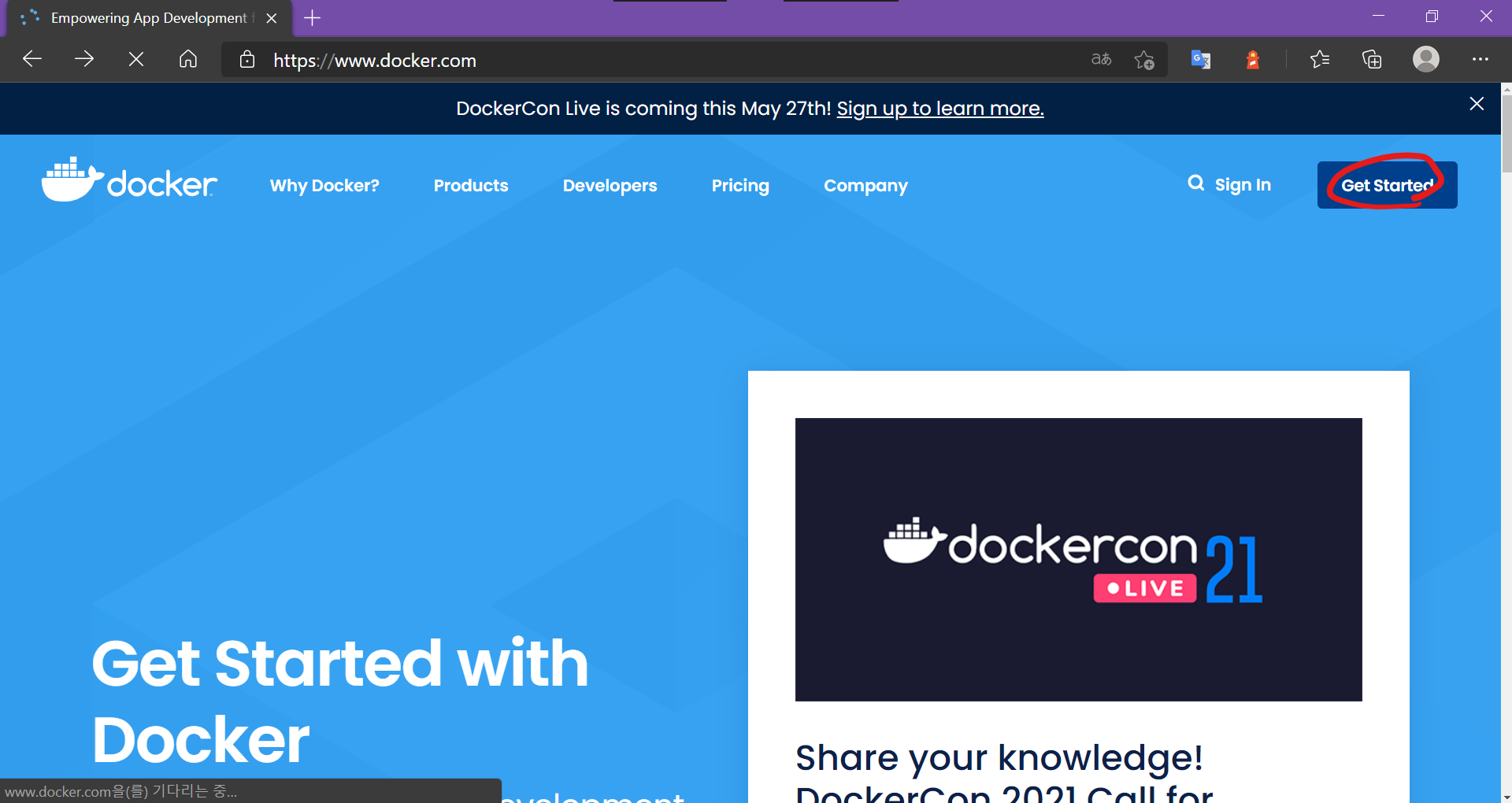 도커 홈페이지 접속하여 Get Started를 선택한다.