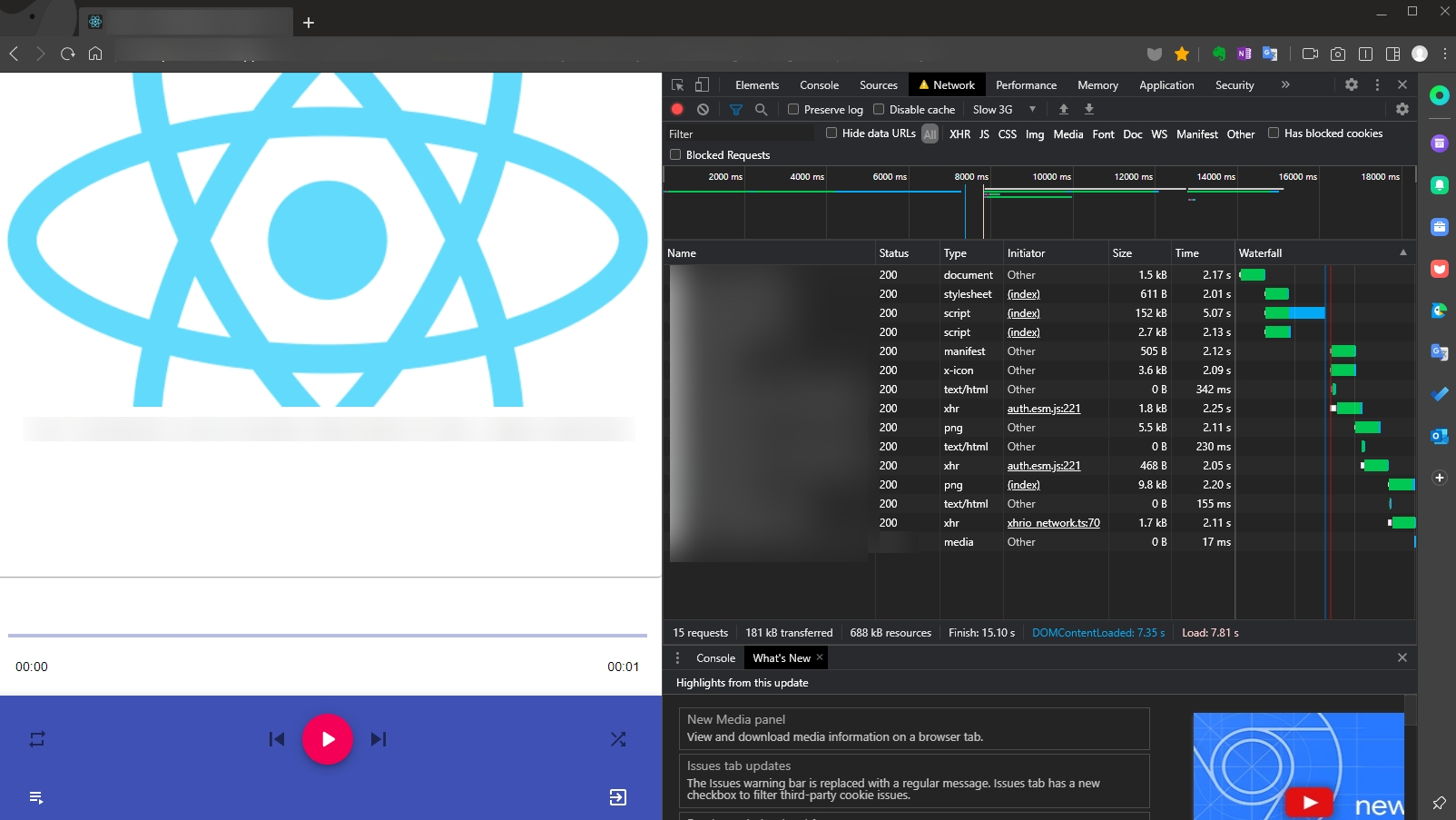 스캔결과 스캔하게되면 주요 패키지의 용량, 다운로드시간이 표시된다. 소요시간의 정확도를 확인해보고자 브라우저 개발툴에서 네트워크 속도를 "slow 3G"로 설정한 뒤, 사이트에 접속해보니 대략 12~15초 정도 소요되었다.