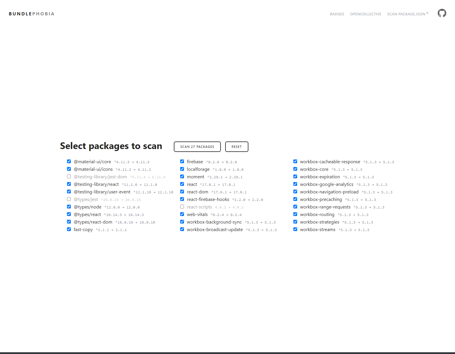 이전에 만들었던 music-web-player 의 package.json을 올려보았다. devDependencies으로 분류해야할 패키지와 사용하지 않는 패키지등이 몇개 존재하긴 하지만 그냥 스캔해보겠다.