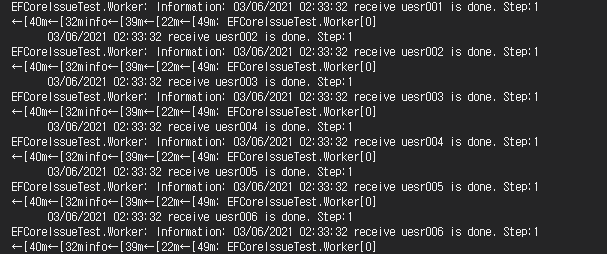 using System; using System.Collections.Generic; using System.Text; namespace EFCoreIssueTest.Models.Mail { public class ReceiveUser { public int TemplateID { get; set; } public string UserID { get; set; } public string Name { get; set; } public string Addr { get; set; } public int Step { get; set; } } }Worker는 초기데이터를 입력한 후, ReceiveUser에서 Step이 3인 대상자를 추출하여 Log를 출력하는 작업을 10초마다 반복한다. Worker2는 5초 후 ReceiveUser에 입력된 모든 데이터의 Step을 3으로 변경시킨다.