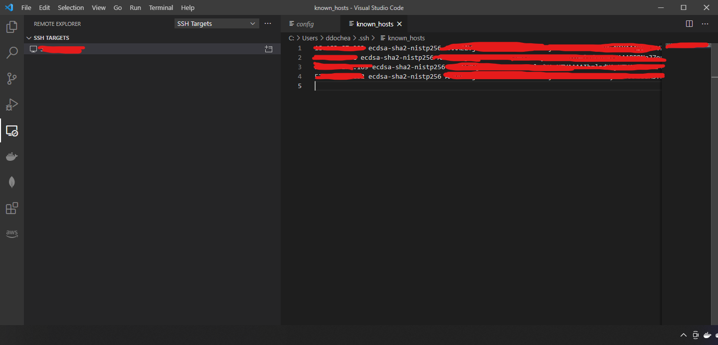 Visual Studio Code에서 Lightsail 인스턴스에 SSH를 정상적으로 연결하면, known_hosts 파일에 연결정보와 관련된 키값이 저장된다. 해당파일은 대게 User 폴더 내 .ssh 디렉토리에 위치해있다.
