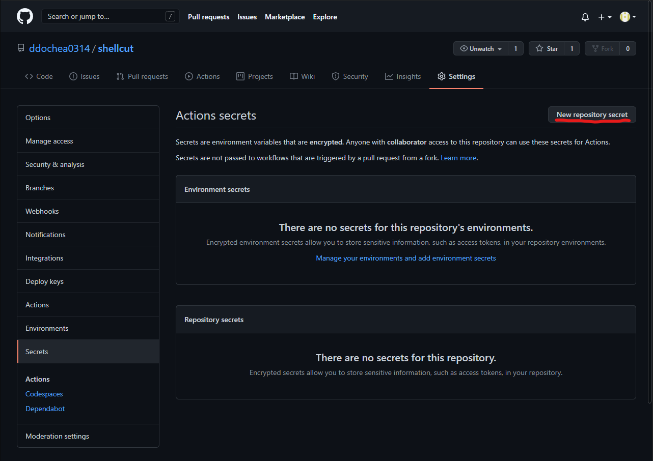 리포지토리의 Settings 탭으로 이동한 뒤, Secrets 메뉴에서 New repository secret을 눌러준다.