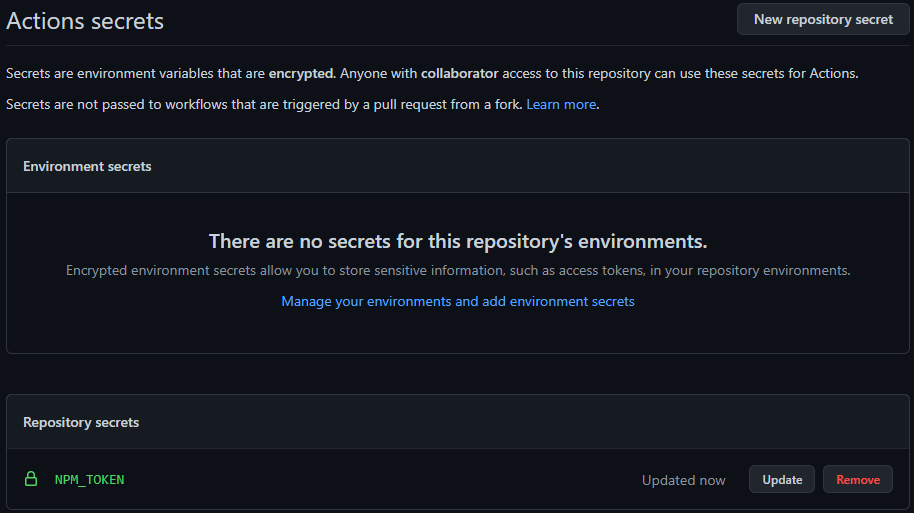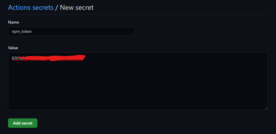 이전 단계에서 생성했던 npm token을 "npm_token"이란 이름의 Secret 값으로 추가한다.