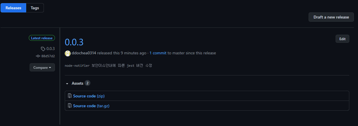 생성하고 나면 소스코드 압축본이 담긴 Release 가 기록된다.