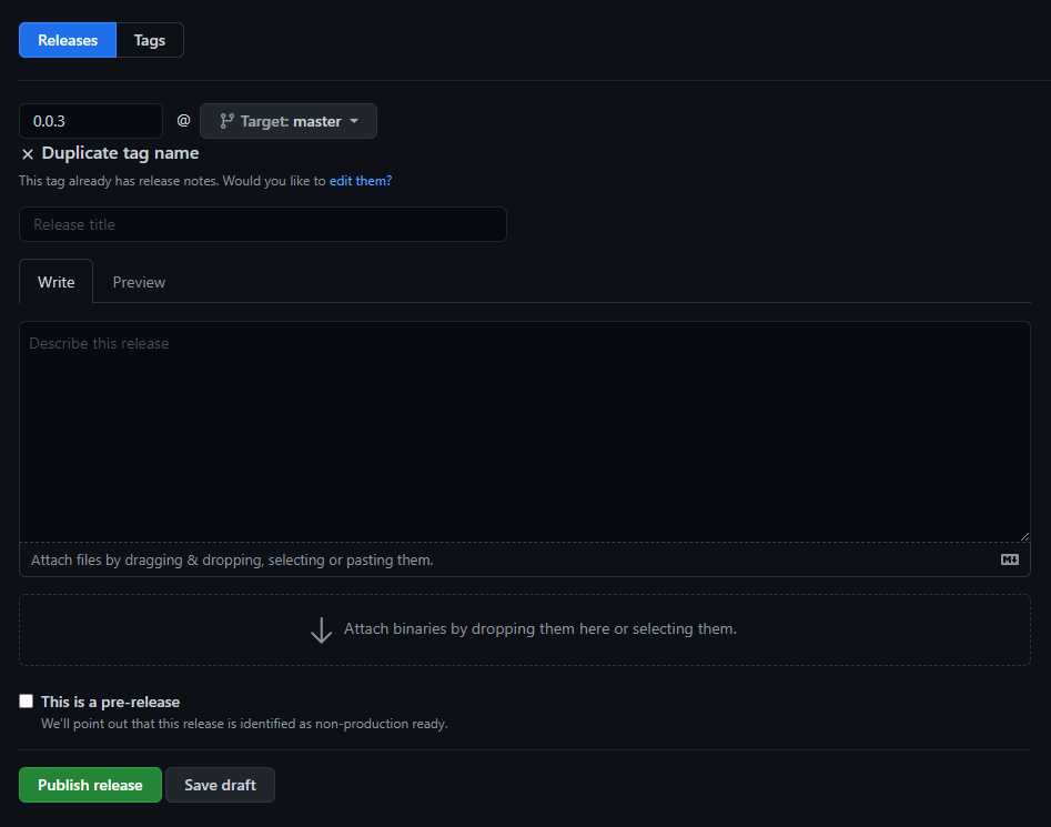 추가버튼을 누르면 태그 입력과 릴리즈에 대한 설명을 작성하는란이 표시된다. 필요한 내용을 작성한 후, "Publish release"를 누른다.