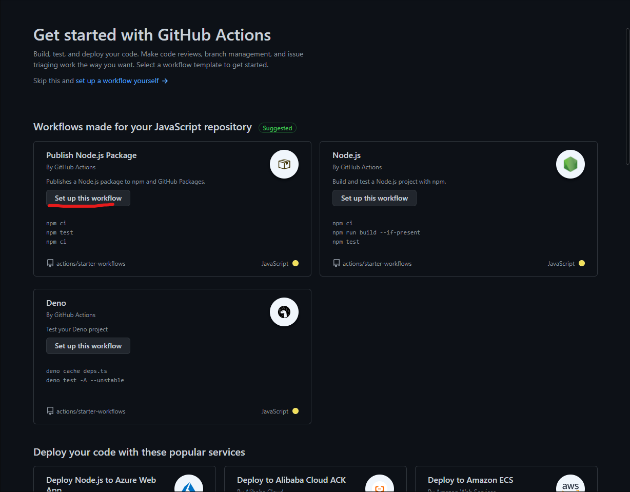 # This workflow will run tests using node and then publish a package to GitHub Packages when a release is created # For more information see: https://help.github.com/actions/language-and-framework-guides/publishing-nodejs-packages name: Node.js Package on: release: types: [created] jobs: build: runs-on: ubuntu-latest steps: - uses: actions/checkout@v2 - uses: actions/setup-node@v1 with: node-version: 12 - run: npm ci - run: npm test publish-npm: needs: build runs-on: ubuntu-latest steps: - uses: actions/checkout@v2 - uses: actions/setup-node@v1 with: node-version: 12 registry-url: https://registry.npmjs.org/ - run: npm ci - run: npm publish env: NODE_AUTH_TOKEN: ${{secrets.npm_token}} publish-gpr: needs: build runs-on: ubuntu-latest steps: - uses: actions/checkout@v2 - uses: actions/setup-node@v1 with: node-version: 12 registry-url: https://npm.pkg.github.com/ - run: npm ci - run: npm publish env: NODE_AUTH_TOKEN: ${{secrets.GITHUB_TOKEN}}publish-npm job 영역에 registry-url을 사전에 배포한 패키지의 url로 변경해준다.