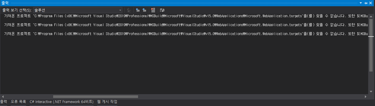 가져온 프로젝트 "C:\Program Files (x86)\Microsoft Visual Studio\2019\Professional\MSBuild\Microsoft\VisualStudio\v15.0\WebApplications\Microsoft.WebApplication.targets"을(를) 찾을 수 없습니다.