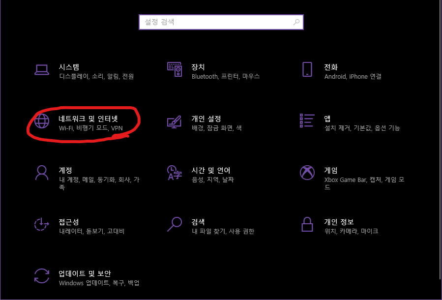 설정화면에서 "네트워크 및 인터넷" 항목을 선택한다.