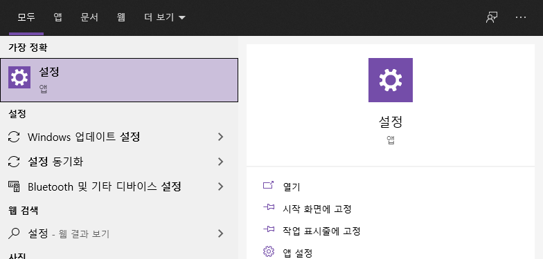Windows 검색창에서 설정(Settings)를 찾아 연다.