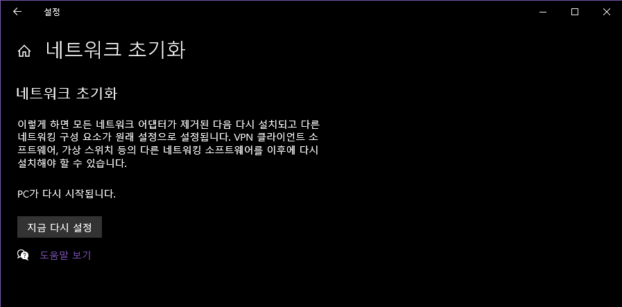 지금 다시 설정을 누르면, 초기화 여부를 묻는 창이 한 번더 표시된다. 예를 누른 후 PC를 재실행한다.