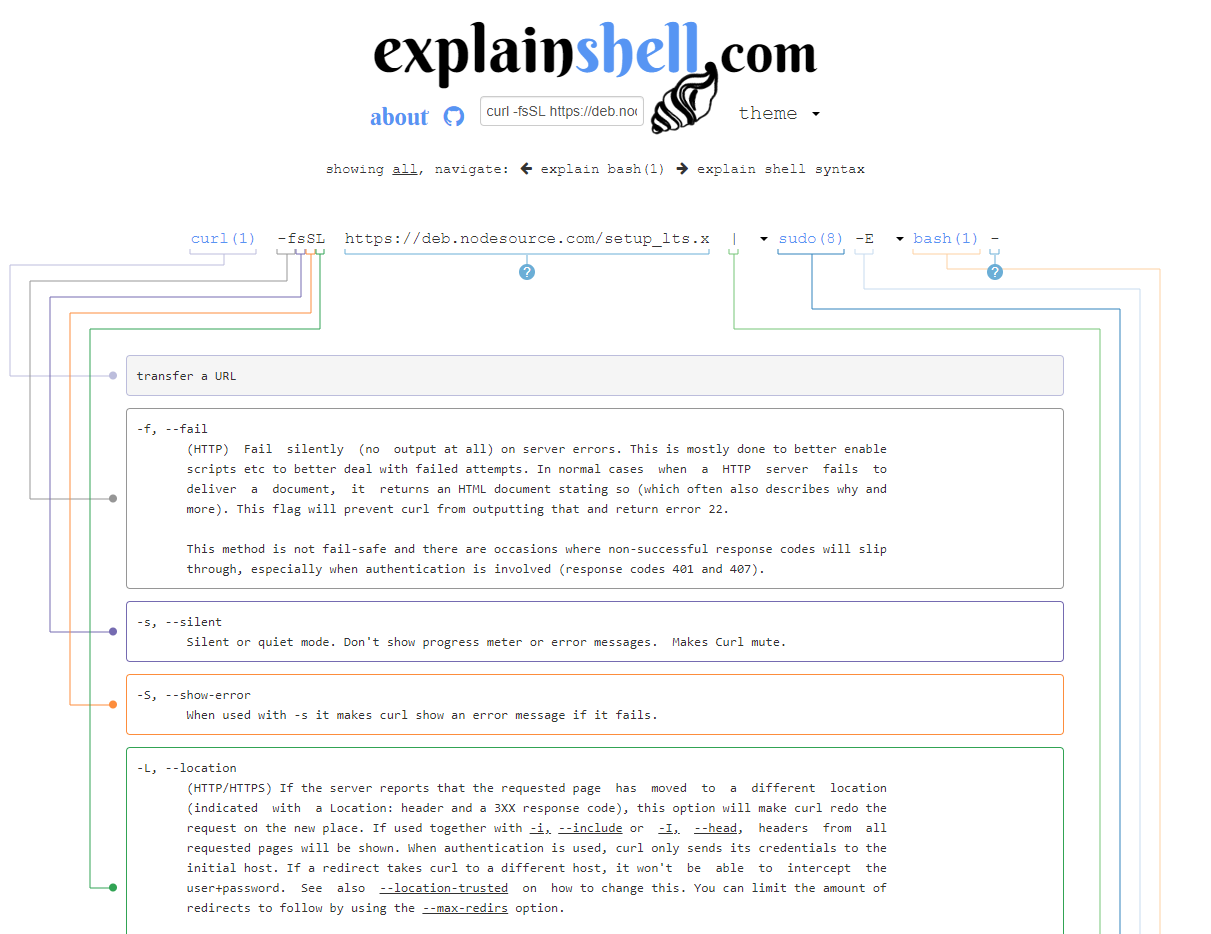 그런데 잘 쓰긴 하지만, 그 자체의 의미를 모두 아는가? 나만 그렇다면 어쩔 수 없지만, 그렇지 않다면 이번에 소개할 사이트 explainshell.com 가 도움이 될 것이다.