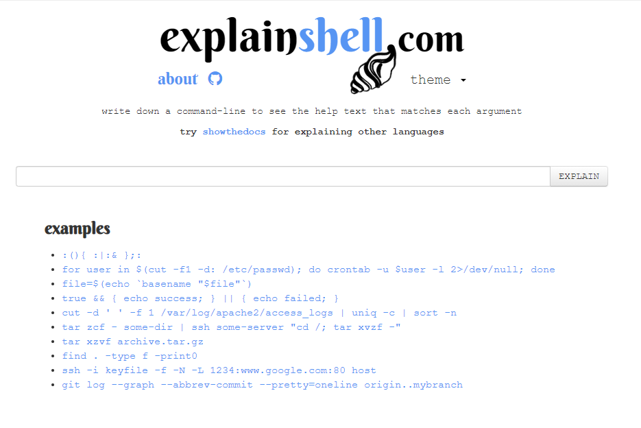 explainshell.com는 그간 모르고 쓰던 명령어를 검색창에 입력하면, 각 명령어 및 옵션에 대한 설명이 결과로 검색되는 사이트이다.