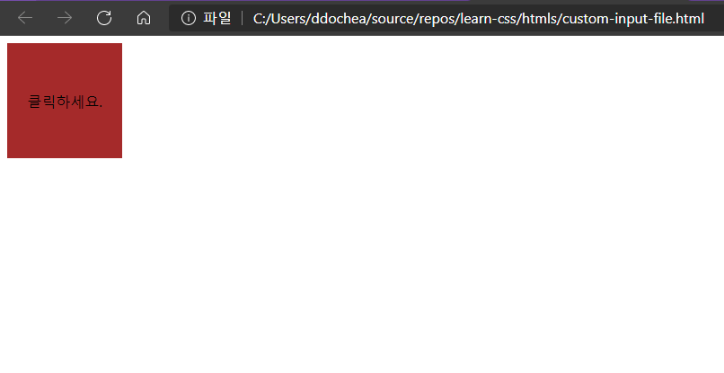 <!DOCTYPE html> <html> <head> <meta charset='utf-8'> <meta http-equiv='X-UA-Compatible' content='IE=edge'> <title>Page Title</title> <meta name='viewport' content='width=device-width, initial-scale=1'> </head> <body> <input id="file" type="file" style="display: none;" /> <label for="file" style="display: flex; justify-content: center; align-items: center; width:128px; height:128px; background-color: brown;"> 클릭하세요. </label> </body> </html>결과는 아래와 같이 나온다.