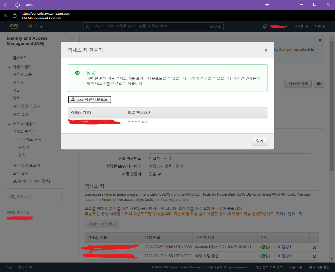 [액세스 키 만들기]를 눌러 새로 생성한 액세스키 csv 파일을 받는다.