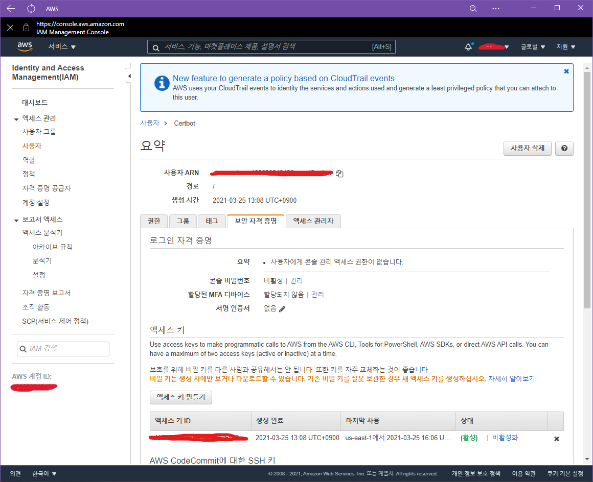 지난시간에 생성한 액세스키(AWS_ACCESS_KEY)와 액세스 비밀키(AWS_SECRET_ACCESS_KEY)를 잘 보관했다면 건너뛰어도 무방합니다.