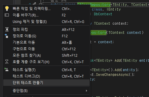 설치 후 에디터에서 테스트할 클래스를 선택하고 "단위 테스트 만들기"를 선택하면, xUnit 기반의 테스트 프로젝트도 자동 생성할 수 있다.