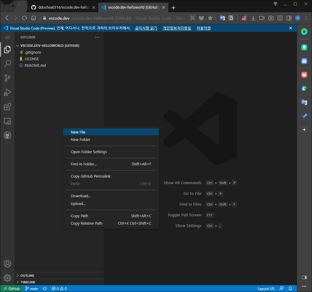 Github 로그인 인증까지 완료하고 나면 아래와 같이 vscode.dev에 생성한 프로젝트 파일이 표시된다.