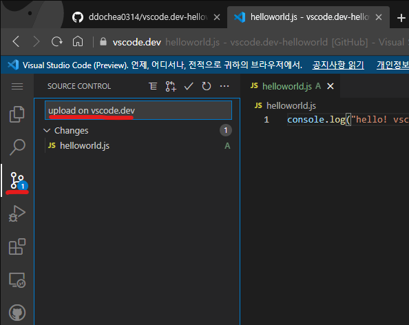 console.log("hello! vscode.dev!!")4. Commit 하기