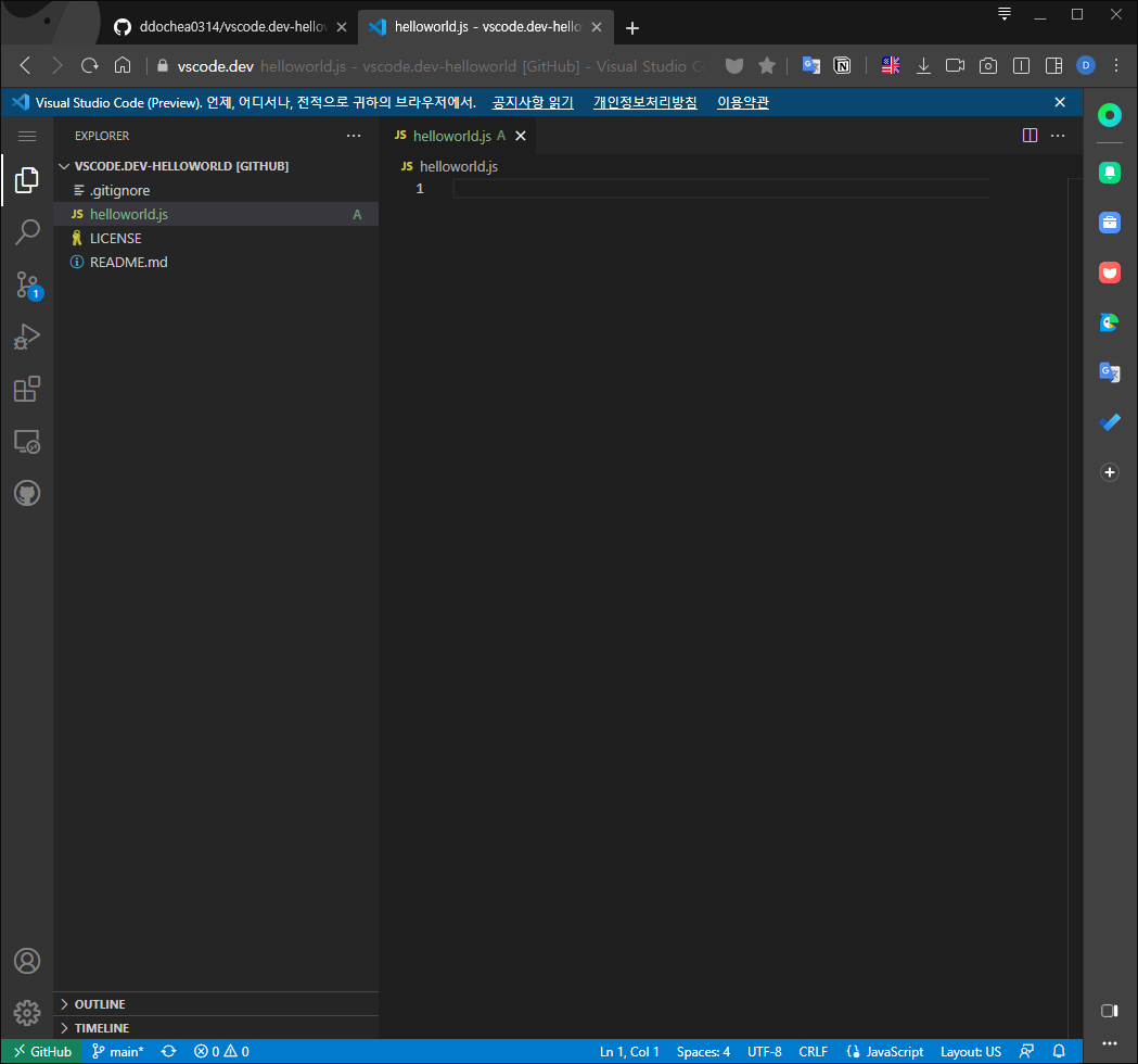테스트를 위해 helloworld.js 를 생성한다. 생성방법은 설치형 VSCode와 유사하다.