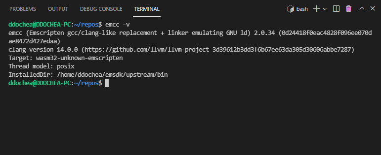 emcc -v 명령어로 설치에 이상이 없는지 확인한다.