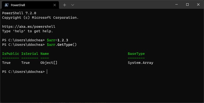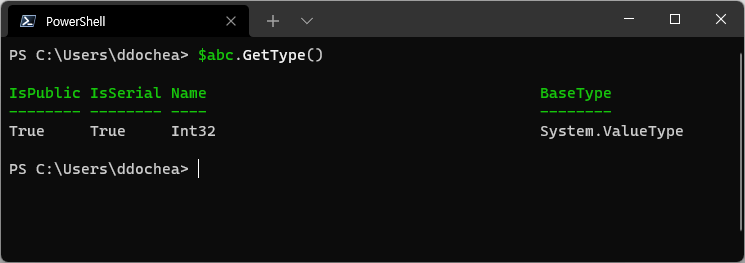 지난번 언급한 것처럼, Powershell은 Type 개념이 존재한다. 변수명 뒤에 .GetType() 함수를 입력하면 변수의 타입을 확인할 수 있다.