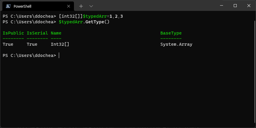 [int32[]]$typedArr=1,2,3 #타입을 지정한 배열함수 생성