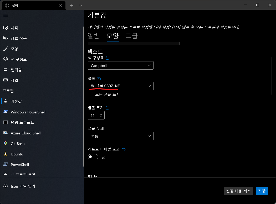 터미널 설정에서 [프로필]->[기본값]->[모양]을 선택한 후, 설치한 글꼴을 찾아 설정한다.