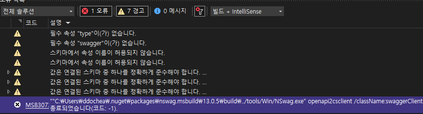 Swagger 기반 OpenAPI 스펙에 맞춰 Web API 개발 후 Visual Studio 서비스 참조 기능을 통해 Client를 자동생성하는 작업을 테스트 하는데 아래와 같은 오류가 발생했다.