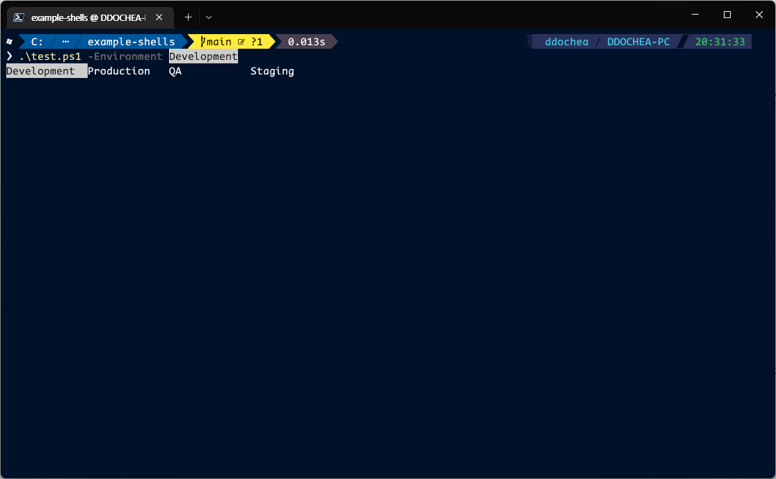 $Environmnet를 받아 작업을 처리하는 ps1 파일 실행시, 필수로 'Development','QA','Staging', 'Production' 중 1개는 필수로 입력해야 한다.해당 설정을 처리하면 Pwsh 스크립트 에서 아래와 같이 파라메터를 가이드 받을 수 있다.