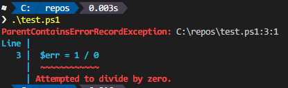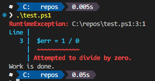 $err = 1 / 0 Write-Host "Work is done."실행하면 runtimeerror가 발생하게 되는데, 문제는 다음 코드인