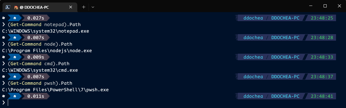 그럴 때 아래 명령어를 이용해보자(Get-Command {명령어 또는 프로그램명}).Path아래 스크린샷은 해당 명령어를 사용한 예시이다. 사용자의 시스템에 따라 다소 차이가 있을 수 있으므로 참고만 하자.