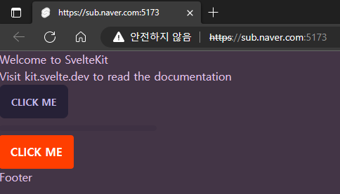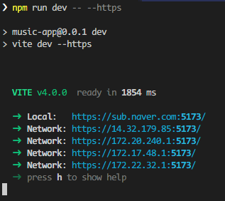 import { sveltekit } from '@sveltejs/kit/vite'; import basicSsl from '@vitejs/plugin-basic-ssl'; /** @type {import('vite').UserConfig} */ const config = { plugins: [sveltekit(), basicSsl()], server: { host: 'sub.naver.com' } }; export default config;2. hosts 에 사용할 도메인 매핑