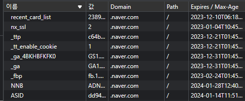 브라우저 개발툴을 열고 쿠키를 확인해보면 생성한 도메인과 관련된 쿠키가 보인다.