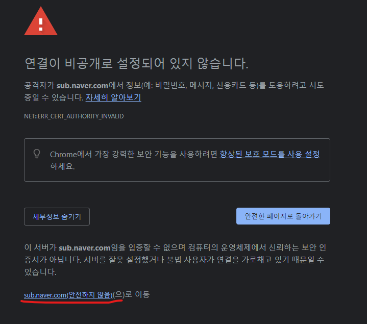 Local에 표기된 URL로 접속하면 경고 페이지가 표기되는데, 자체 서명된 인증서와 같이 신뢰기관이 발급한 인증서가 아니기 때문에 표기된다. 세부정보를 누른 뒤, {도메인주소}(안전하지 않음)을 눌러 접근하면 된다.