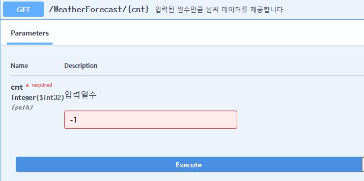 System.ComponentModel.DataAnnotations네임스페이스에 속한 특성(Attribute)를 통해 요청값에 대한 유효성 처리를 적용할 수 있다./// <summary> /// 입력된 일수만큼 날씨 데이터를 제공합니다. /// </summary> /// <param name="cnt" example="7">입력일수</param> /// <returns></returns> [HttpGet("{cnt}", Name = "GetWeatherForecastByCount")] public IEnumerable<WeatherForecast> Get( [Required][Range(1, 10)] int cnt) { // 이제 cnt 값은 1~10 사이의 값이 필수적으로 들어와야 한다. return Enumerable.Range(1, cnt).Select(index => new WeatherForecast { Date = DateTime.Now.AddDays(index), TemperatureC = Random.Shared.Next(-20, 55), Summary = Summaries[Random.Shared.Next(Summaries.Length)] }) .ToArray(); }Required속성 적용시 swagger 문서상에 필수요소임을 표기하게 되며,Range설정에 따라 1~10 사이의 값만 받을 수 있도록 Swagger 문서가 동작을 제한한다.
