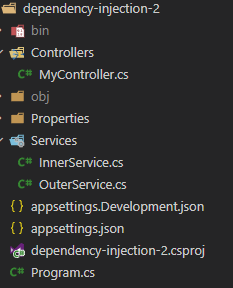AddScoped함수로 의존성 주입하는 코드를 추가한다.builder.Services.AddScoped<OuterService>(); builder.Services.AddScoped<InnerService>();6. 실행 및 Get 호출로 결과 확인