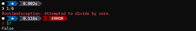 아래 예시에서 1/0 실행 후 $?를 입력하면 0으로 나누기 오류로 인해 False가 출력된다.