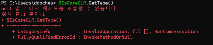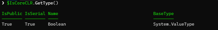 PowerShell Core에서의 실행결과 예측가능한 결과가 나왔지만 $IsCoreCLR 값은 Windows PowerShell 자체에서 유효하지 않을 수 있다. $IsCoreCLR.GetType() 를 실행하면 Core 기반 PowerShell에선 아래 이미지와 같이 정상적인 정보가 표출된다.