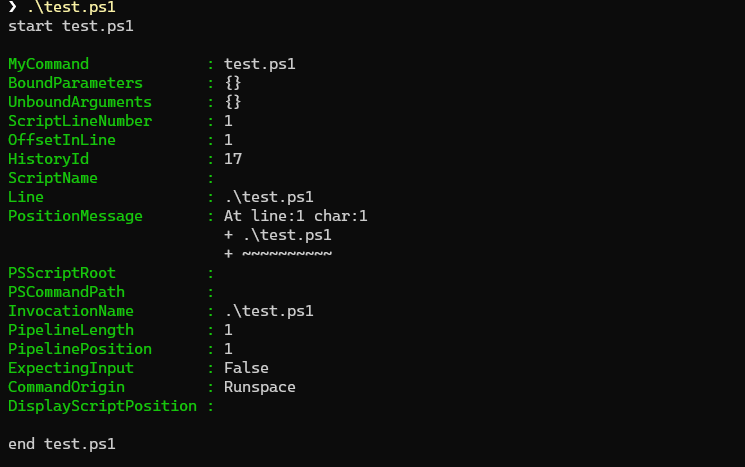 Write-Host 'start test.ps1' $MyInvocation Write-Host 'end test.ps1'test1.ps1 실행시 아래와 같이 표기된다. HistoryId 는 사용자가 pwsh 세션 시작시점부터 사용한 명령어 수에 따라 다를 수 있다.