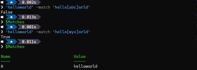 'helloworld' -match 'hello[wyx]orld' 에선 -match에 일치결과가 있으므로 $Matches 에 값이 담긴것을 확인할 수 있다.