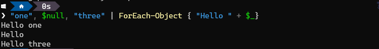 "one", $null, "three" | ForEach-Object { "Hello " + $_}