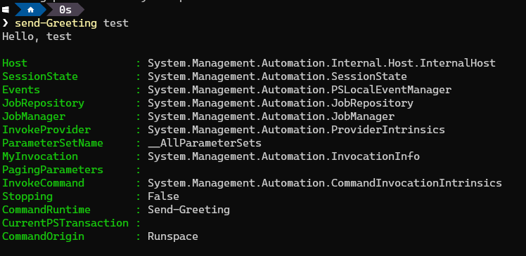 함수 추가 후 새로운 파워셸 창을 열어 메소드를 실행하면, 아래 이미지와 같이 $PSCmdlet 정보가 표시된다.