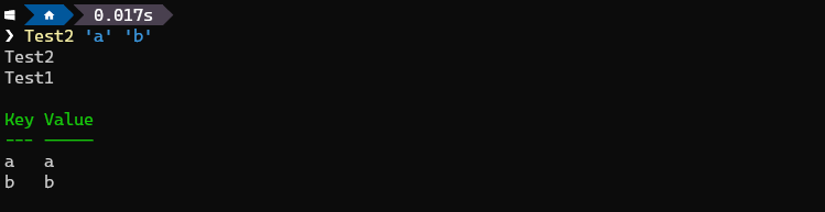 파일 추가 후, 새로운 파워셸 창에서 Test2 함수를 사용하면 이미지와 같이 입력한 파라메터에 대한 Key-Value 형식의 $PSBoundParameters 값을 확인할 수 있다.