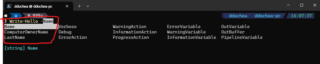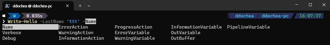 function Write-Hello { [CmdletBinding(DefaultParameterSetName = 'Default')] param ( [Parameter(Mandatory, ParameterSetName='Default', Position=0)] [string] $Name, [Parameter(Mandatory, ParameterSetName='Second', Position=0)] [switch] $ComputerOwnerName, [Parameter(Mandatory, ParameterSetName='Default', Position=1)] [string] $LastName ) if ($ComputerOwnerName) { $com = Get-ComputerInfo Write-Host "Hello $($com.CsPrimaryOwnerName)" } else { Write-Host "Hello, $Name! $LastName" } }작성이 완료되었다면 새로운 Powershell 창을 열고 Write-Hello 입력 후 -Name, -ComputerOwnerName, -LastName 를 찾아보자. 입력한 모든 파라메터가 사용가능하게 나타날 것이다.