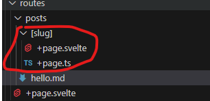 파라메터를 통해 경로를 동적으로 처리할 수도 있다. posts 폴더 아래에 [slug] 라는 폴더명을 추가하고, +page.svelte, +page.ts를 옮긴 뒤 +page.ts를 아래와 같이 수정한다.