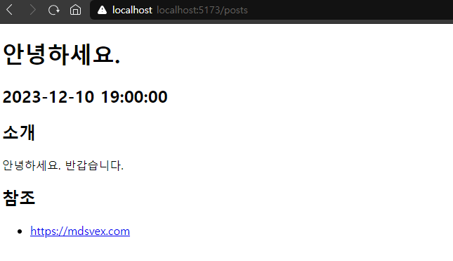 npm run dev 명령어로 svelte 프로젝트 실행 후 추가한 페이지 경로로 이동한다. 별도의 수정이나 여러 프로젝트를 함께 실행중인게 아니라면 http://localhost:5173/posts 로 접근 가능할 것이다.